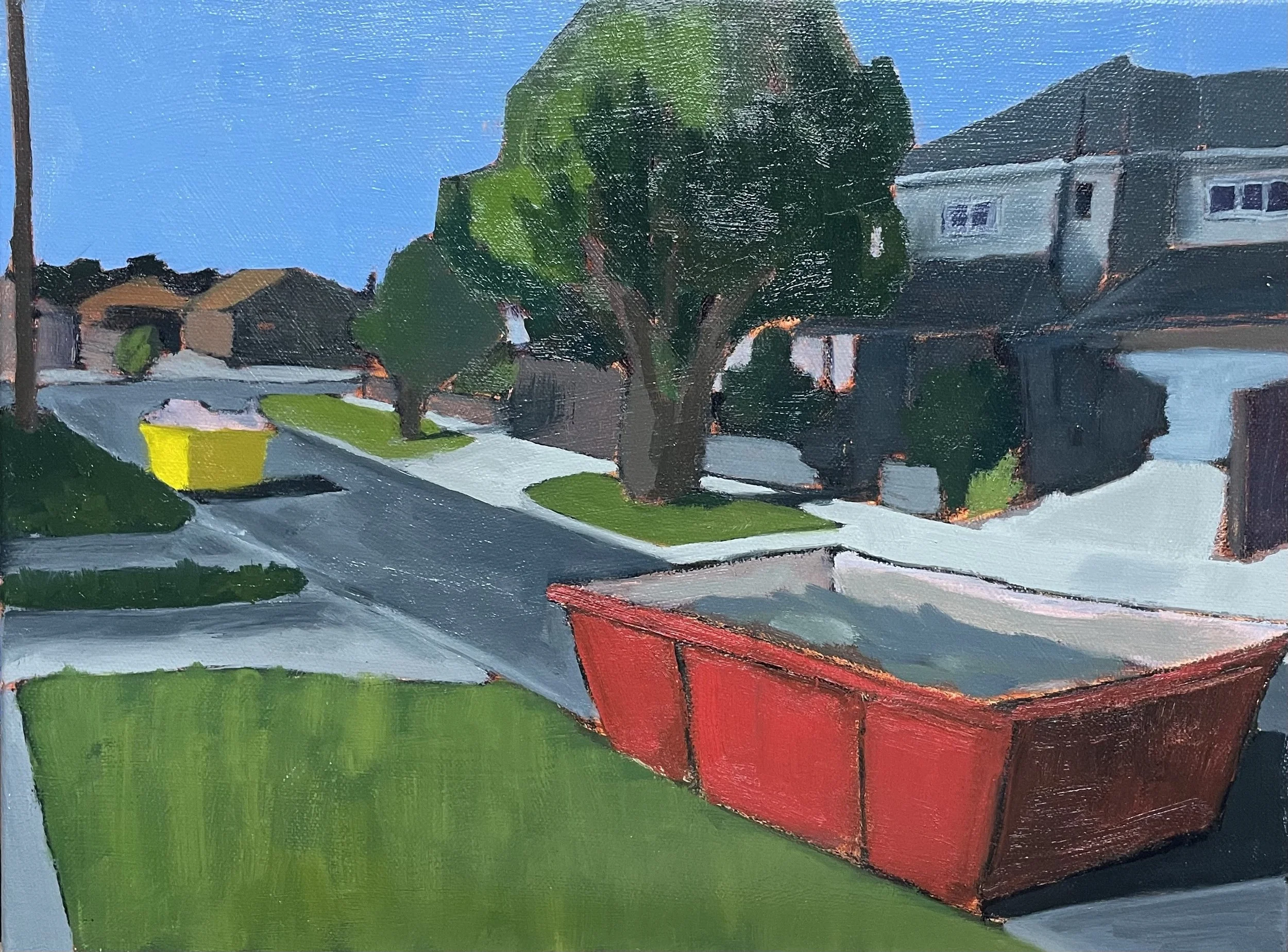 Red skip next to green colonial pox box, oil on canvas, 305x405mm (12x16”), 2022.