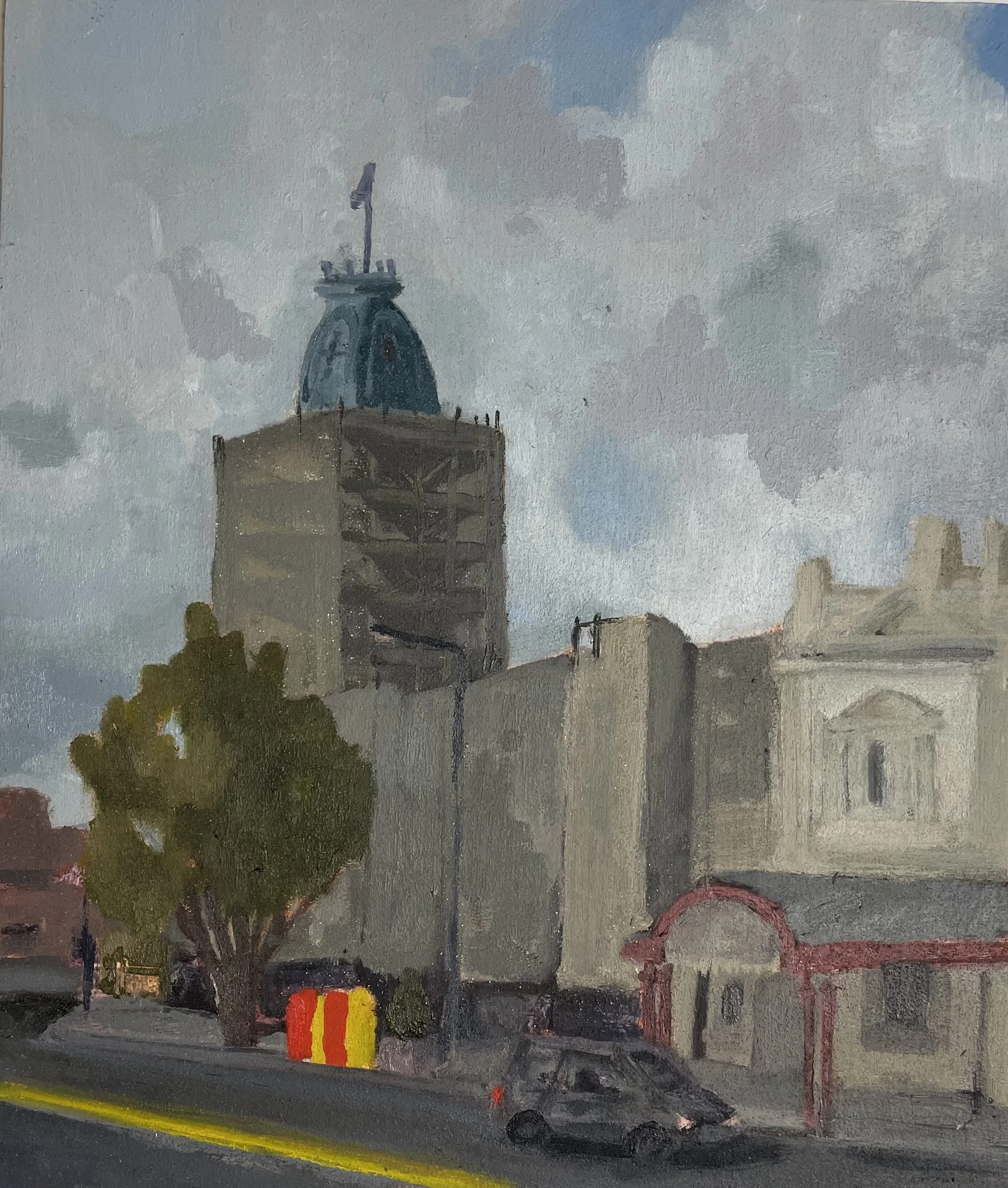 North Melbourne Town Hall behind scaffolds (Errol St), oil on board, 205x305mm (8x12”), 2025. Commission.