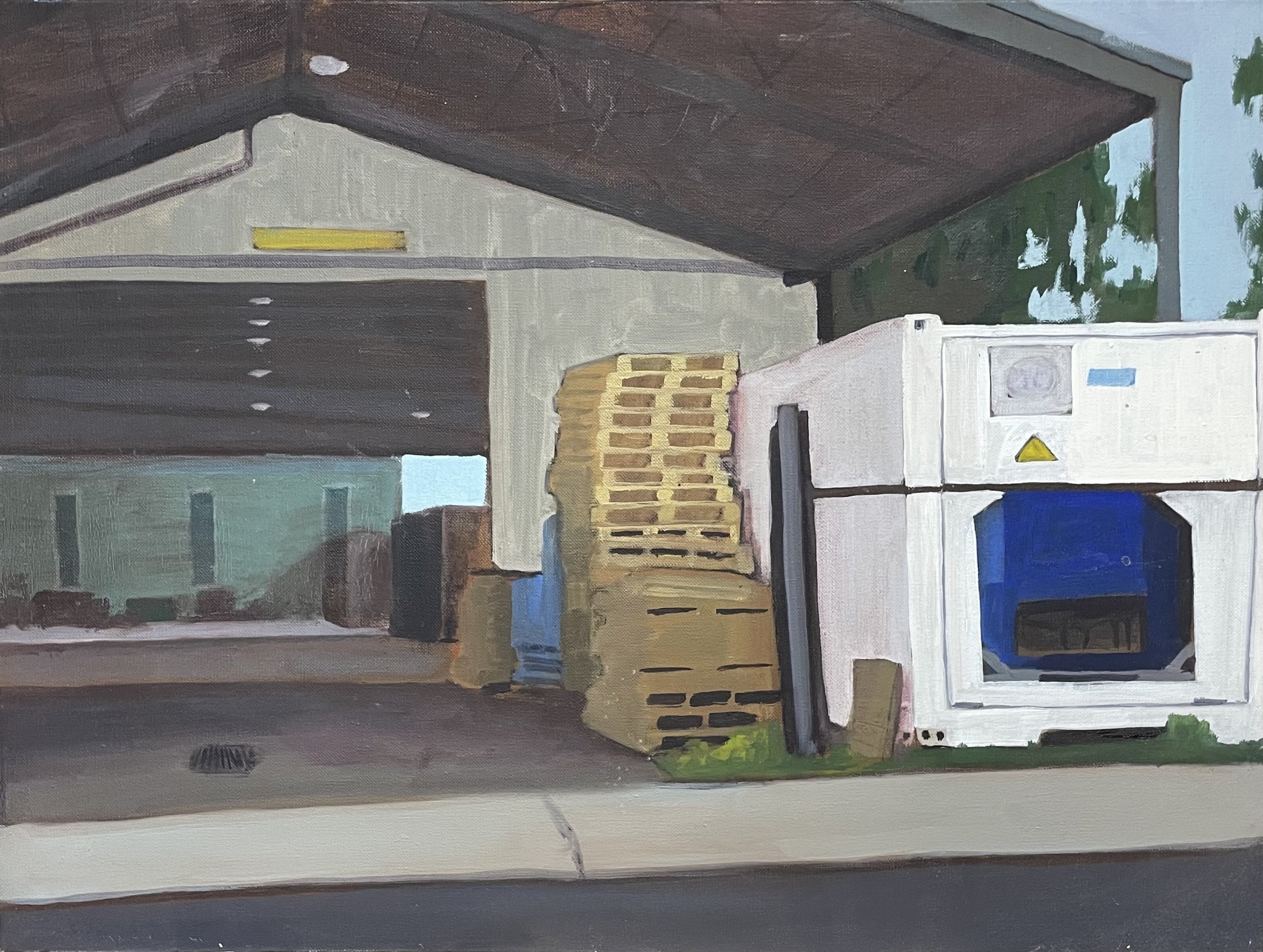 Looking through a warehouse, oil on canvas, 430x580mm (17x23”), 2022.