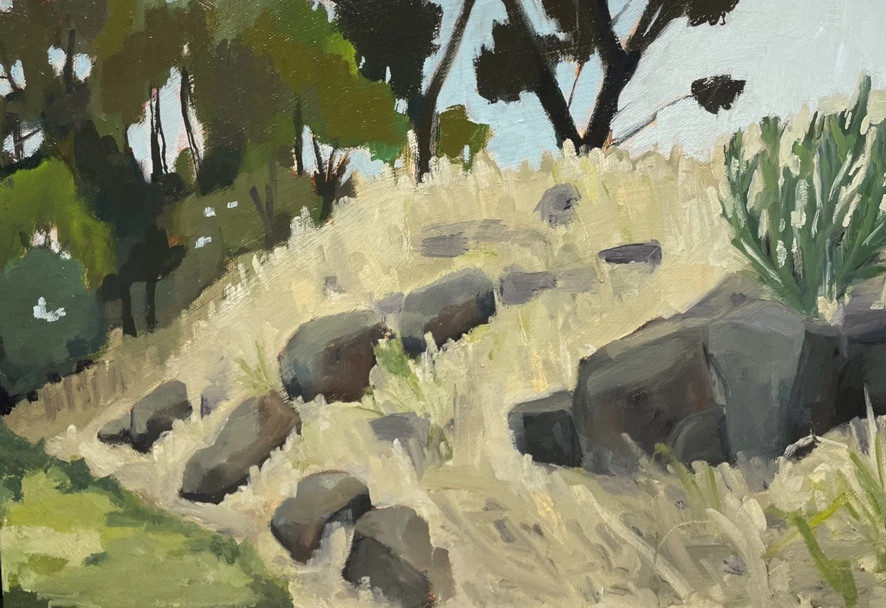 Volcanic rocks near Northlands, oil on canvas, 305x405mm (12x16”), 2023.